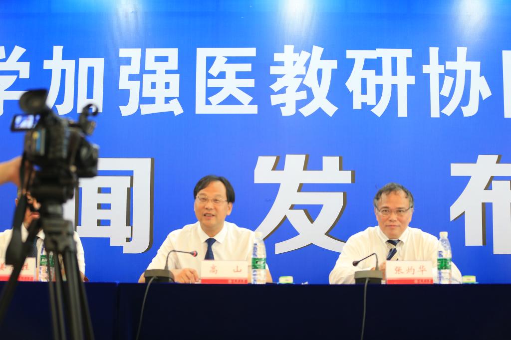 5月14日上午10:00,学校在附属长沙中心医院多功能厅举行加强医教研协同创新改革新闻发布会,来自中央驻湘媒体、香港驻湘媒体、省内主要媒体等近30余位媒体记者参会,校党委书记高山主持新闻发布会。