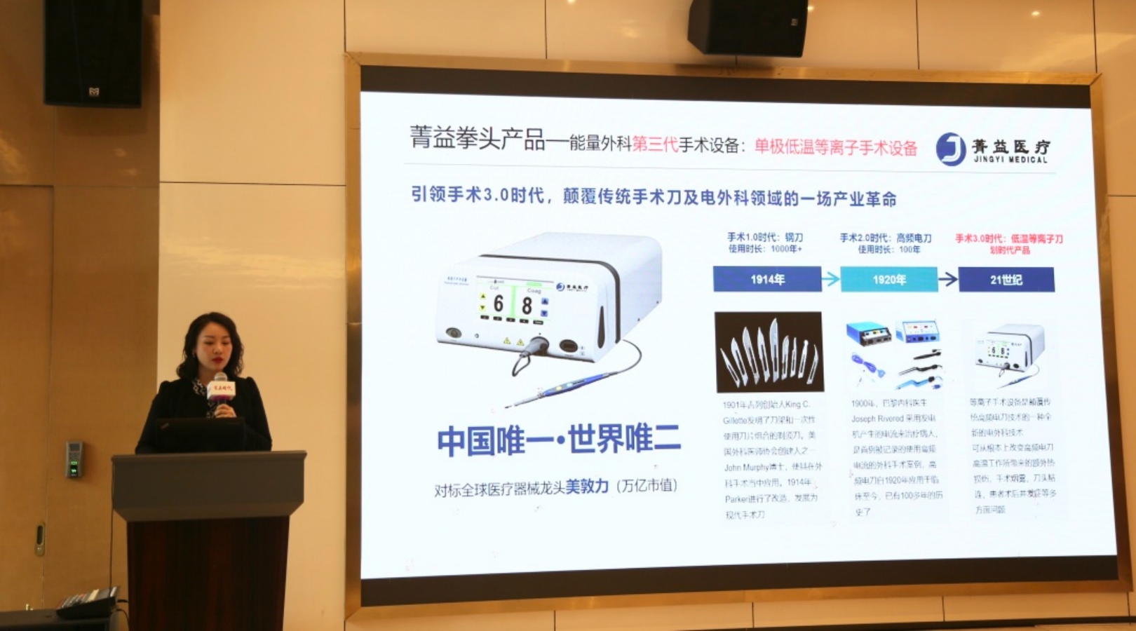 菁益医疗副总经理江思明就公司发展历程、产品创新、经营理念等向校友们进行了详细介绍,并展示了创新产品低温单极等离子电刀等产品在手术中的优势与产品特点,得到了校友们一致的高度认可。