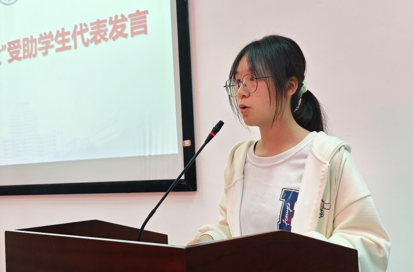 “华星助学金”受助学生代表徐艳雪向学校和校友们表达了感恩之情,并表示以后将要勤勉务实、努力学习,不负期望。“陈琛奖学金”获奖学生代表陈晓晴感恩校友们的善举及其温暖的奖励,向师生汇报了自己的学习成果,并展示对未来学习生活奋力拼搏的坚定决心。