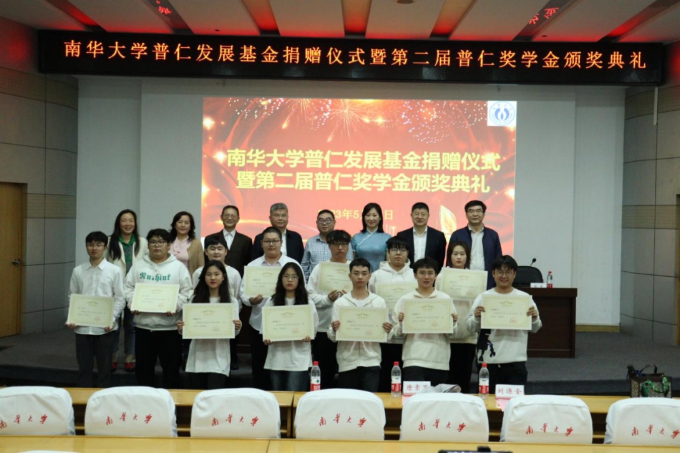 教育发展与校友联络办主任李先国宣读第二届普仁奖学金表彰决定。与会领导及嘉宾为12名获奖学生颁奖并合影留念。