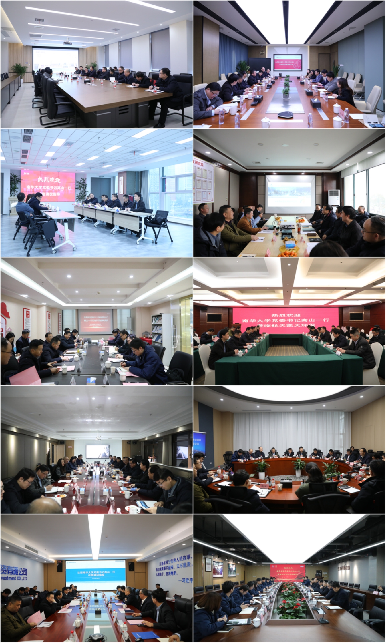 高山一行先后来到湖南三安半导体有限责任公司、圣湘生物科技股份有限公司、澳优乳业股份有限公司、湖南中科助英智能科技研究院有限公司、航天凯天环保科技股份有限公司、湖南麦格米特电气技术有限公司、中核健康投资有限公司、山河智能装备股份有限公司和校友企业长沙至善德医疗科技有限公司、湖南镭目科技有限公司,与企业负责人就行业人才培养、关键技术联合攻关、科技成果转化等方面进行了深入交流,为有关研究生联合培养基地揭牌,并看望了部分企业校友代表。