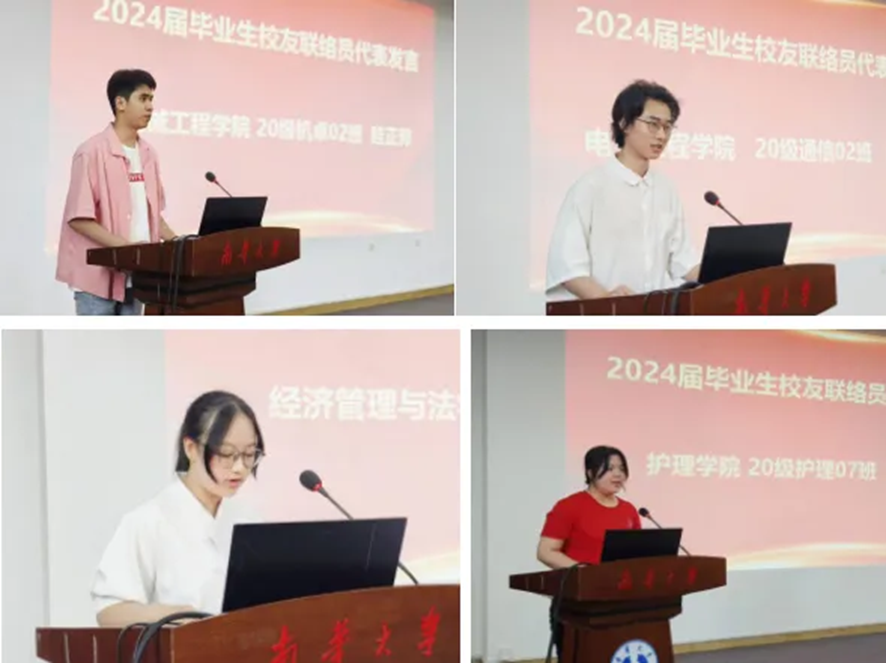 机械工程学院2024届机械设计制造及其自动化专业眭正邦、电气工程学院2024届通信专业陈东亮、护理学院2024届护理专业布裕珂、经济管理与法学学院2024届经济学专业刘聪颖等4名校友联络员代表分别发言,他们回忆了在学校的美好时光,感恩学校的精心培养,表示将珍惜荣誉,勇挑重担,充分履行好校友联络员职责,系好南华校友情感链,为母校和校友事业的发展做出积极的贡献。