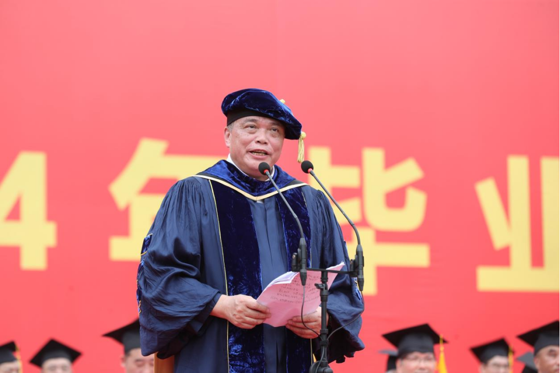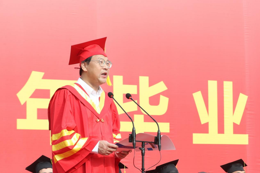 校长讲话中,他寄语毕业生们:“几分钟以后你们就离开会场,带上你们的行装,走向新的生活,无论你们在生活的什么岗位,有一个词对你们很重要,对我们这个社会也很重要,那便是诚信。"他结合自身求学及科研探索的经历,和同学们分享了诚信的重要性,面对当今复杂多变的世界,复杂多变的人生,诚信不仅仅是我们个人道德的基石、社会的基础,更是我们最宝贵的资产。诚信将这个社会维持成了一个,功能齐全、有条不紊的社会整体,它成为了我们的关键和基石,“无论你从事何种职业,诚信是立身之本,是我们每一个人都不能逃避的信用,是我们最有价值的资产,更是社会发展和进步的源泉”。“当今社会,面对越来越多的挑战,诚信显得越发重要,也越发需要我们来维护和坚持”。……,他用充满哲思又娓娓道来的话语,唤起同学的思考。