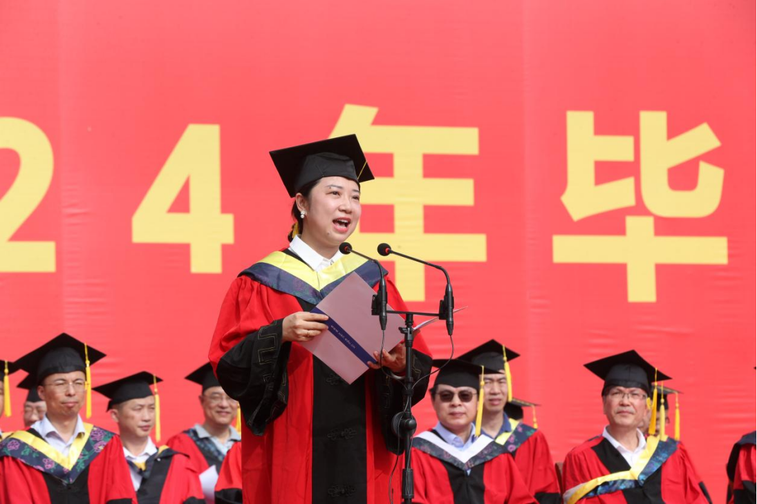 从学生变成了老师,从青春走到了不惑。教师代表欧阳纯萍深情回顾了26年来在南华求知求学、教书育人的经历,以及和同学们相处的四年时光,她说,毕业不是结束,而是一个崭新的开始。希望同学们始终保持对知识的渴望,对生活的热爱,对事业的执着。在未来的道路上不忘初心,砥砺前行,为实现中华民族伟大复兴的中国梦贡献力量。