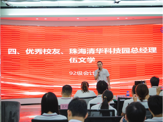 珠海清华科技园总经理伍文学校友(92级会计专业)致开幕词。他表示自己非常荣幸加入珠海校友会,能感受到校友之间团结向上的氛围。他希望各位校友们把本职工作做好,与同事们处理好关系,用过硬的专业能力打好坚实的基础,同时要加强学习,校友之间增进交流,多多合作,共谋发展。