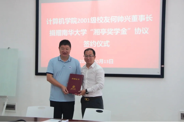 为了激励学生勤奋学习、努力进取,支持学校优秀创新人才的培养,何帅兴校友捐资30万元设立“湘亭奖学金”。签约仪式上,李先国与何帅兴签署了捐赠协议,并为何帅兴颁发捐赠证书。