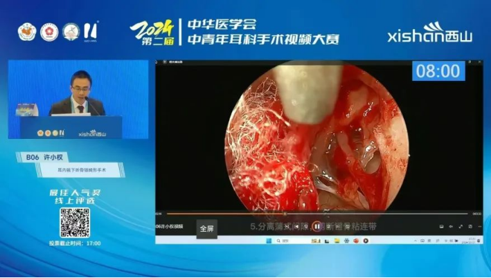许小权医生参赛的作品是《耳内镜下听骨链畸形手术》。在比赛中,他展示了耳内镜技术在处理复杂耳部疾病中的应用,其精细的操作和创新的手术方法赢得了评委的高度评价。