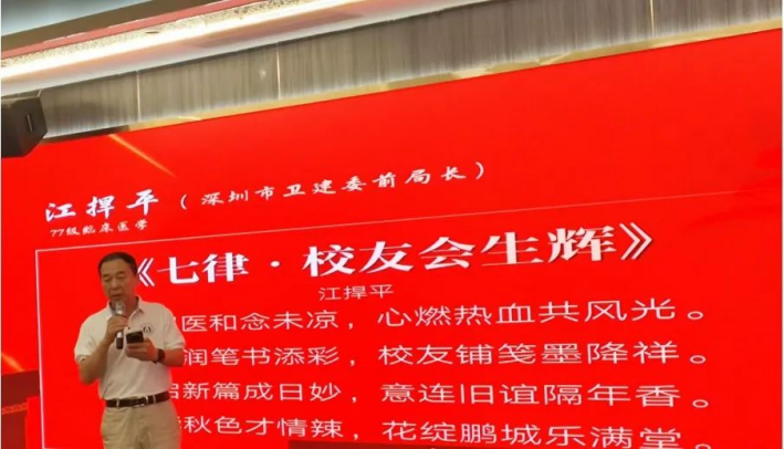 在年会活动的热烈氛围中,77级临床医学专业江捍平校友以一首七言律诗《校友会生辉》深情献礼。