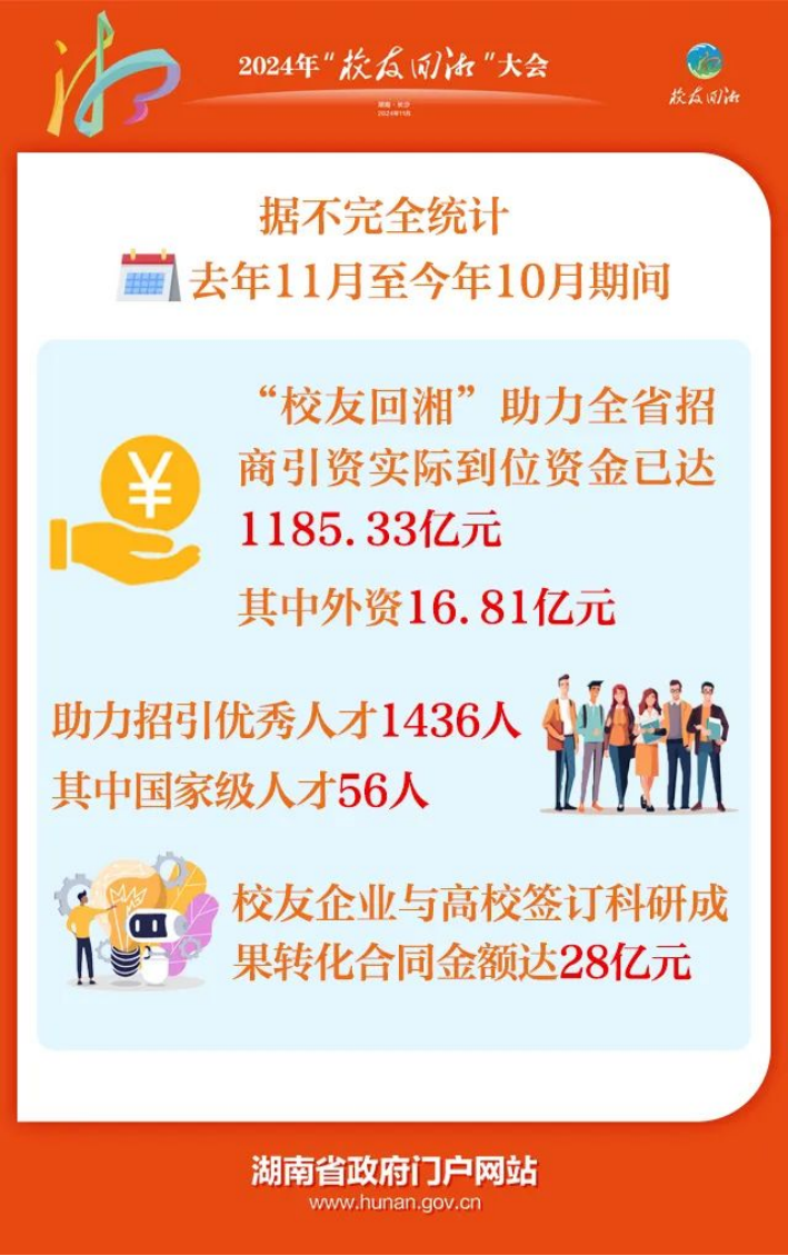 今年初,湖南向广大湖湘校友发出“共襄盛举续华章”的盛情邀约。一年来,大家聚焦“校友+人才、科技、项目、企业、教育”,汇聚了一批杰出人才、催生了一批科创成果、培育了一批产业标杆、涌现了一批情系母校的典型,科技、教育、产业、人才等领域回湘兴湘蔚然成势。