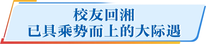 当前,湖南战略机遇空前交汇、产业体系日益完备、创新动能激扬奔腾、营商环境进阶跃升,为广大校友在湘大展宏图铺就了优渥土壤、带来了无限机遇、开拓了全新空间。