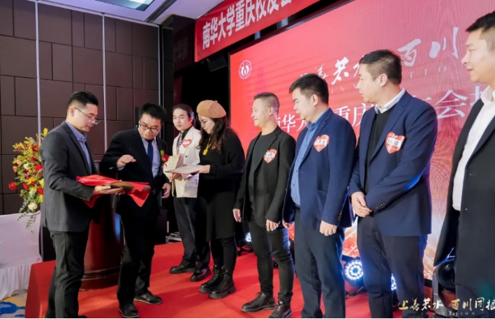 唐振平为重庆校友会荣誉会长、会长、秘书长颁发聘书。新任重庆校友会会长潘路鸿为重庆校友会副会长、副秘书长、理事、监事颁发聘书。