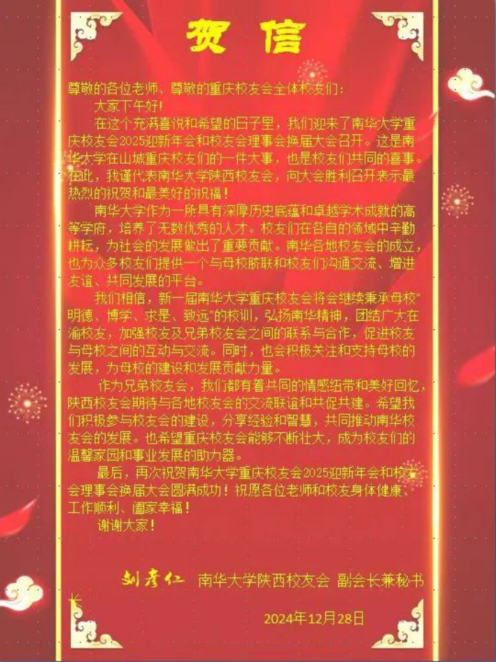 武汉校友会张海涛校友、深圳校友会谢军校友到场祝贺,陕西校友会、浙江校友会、苏州校友会、厦门校友会等兄弟校友会发来祝贺视频、贺信,共同祝贺重庆校友会换届大会暨2025迎新年会圆满举行,并希望进一步加强地方校友会之间的交流与合作,汇聚校友力量和智慧,相互支持,共同进步,继续关心支持母校的建设发展。