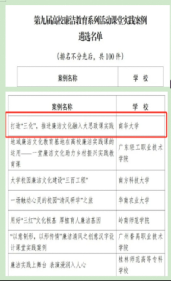 2024年,学校在第九届高校廉洁教育系列活动中,作品《<湖湘廉吏>系列动漫之彭玉麟:以寒士始,愿以寒士归》《打造“三化”,推进廉洁文化融入“大思政课”实践》分别获得教育部第九届高校廉洁教育系列活动“视廉清心”视频征集百佳作品和课堂实践百佳案例。在湖南省“四个一批”廉洁教育系列活动中,学校获湖南省教育系统“廉洁文化宣传月”优秀单位。坚持守正创新,深入开展多形式的廉洁教育活动,持续营造风清气正浓厚氛围,把廉洁教育贯穿办学治校、教书育人、养德修身始终,为落实立德树人根本任务提供坚强保障。