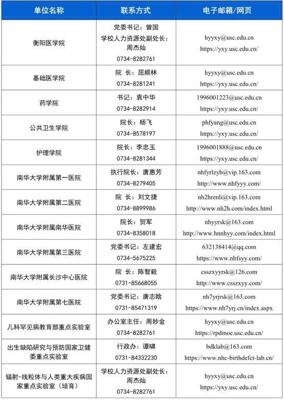 PA官方平台衡阳医学院及下辖各学院、研究机构,PA官方平台附属医院招聘联系人: