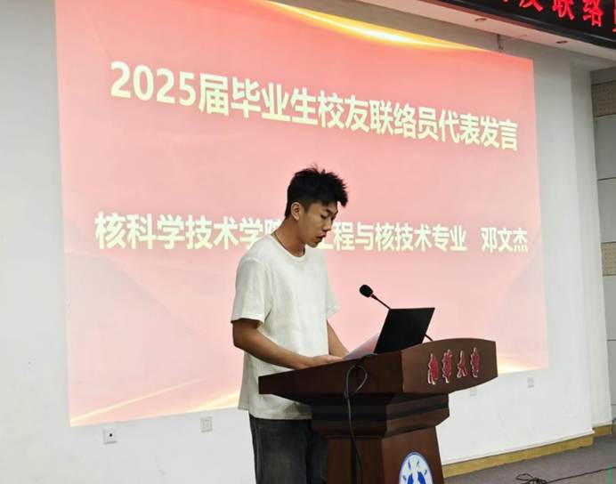 会上,语言文学学院英语专业戴丽莉、基础医学院生物技术专业 梁秋连、核科学技术学院核工程与核技术专业邓文杰、资源环境与安全工程学院矿物资源工程专业吴宝亮、国际学院GYAN OTCHERE POSNASKY YAW等5名校友联络员代表分别发言,他们回忆了在学校的成长历程,感恩学校的精心培养,畅谈了未来联络校友的基本设想,表示要主动适应角色定位,积极作为,编织好“校友、班级、校友会和学校”间情感联系的网络,共创校友和母校更加美好的未来。