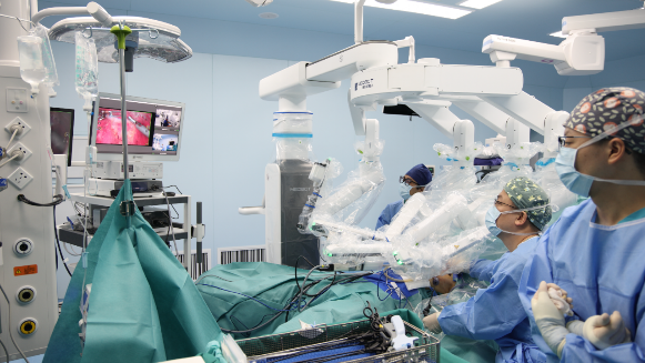 患者古涛(化名)是一位体重接近200斤的中年男性,同时患有糖尿病等多种基础疾病,手术和麻醉风险较高。为确保手术安全,易石坚团队组织了全院多学科会诊(MDT),对患者病情进行深入讨论,制定了周密的手术方案和应急预案。手术中,团队采用了我国自主研发的图迈®腔镜手术机器人系统。在狭窄的解剖空间内,机器人精准完成了探取、剥离、缝合等一系列精细操作,整个手术过程仅耗时2个半小时,几乎实现零出血。