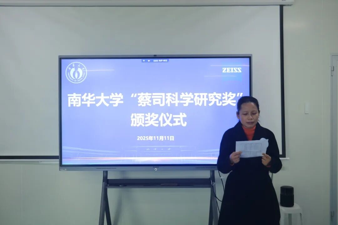 仪式最后,蔡银枝寄语获奖学生,愿他们在未来科研道路上勇攀高峰、再创佳绩,不断实现新突破。同时勉励全体师生紧紧围绕学校服务国家发展的战略部署,向心而行、务真致远,产出更多高水平科研成果,为推动社会发展与科技进步贡献南华的智慧与力量。