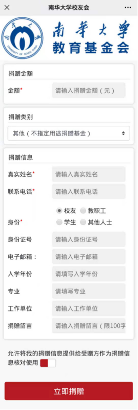 二、在弹出的界面填入捐赠类别项目、金额及个人基本信息,然后点击“立即捐赠”。
