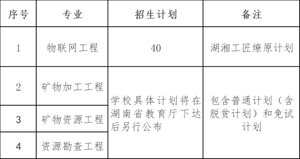 2024年学校专升本招生专业为:物联网工程、矿物加工工程、矿物资源工程、资源勘查工程四个专业,其中物联网工程专业为湖湘工匠燎原计划招收专业,具体招生计划将在湖南省教育厅下达后另行公布。