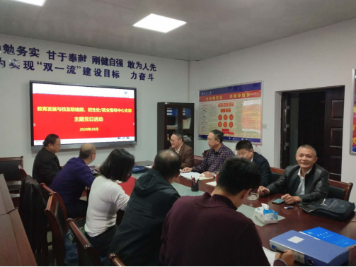 10月23日,教育发展与校友联络部联合招生处/就业指导中心在支部党员活动室组织党员主题党日和职工政治理论学习,活动学习了习近平总书记在湖南考察时的讲话精神,讨论了如何将习近平总书记讲话精神落实到学校建设当中,活动由党支部书记彭新和同志主持。